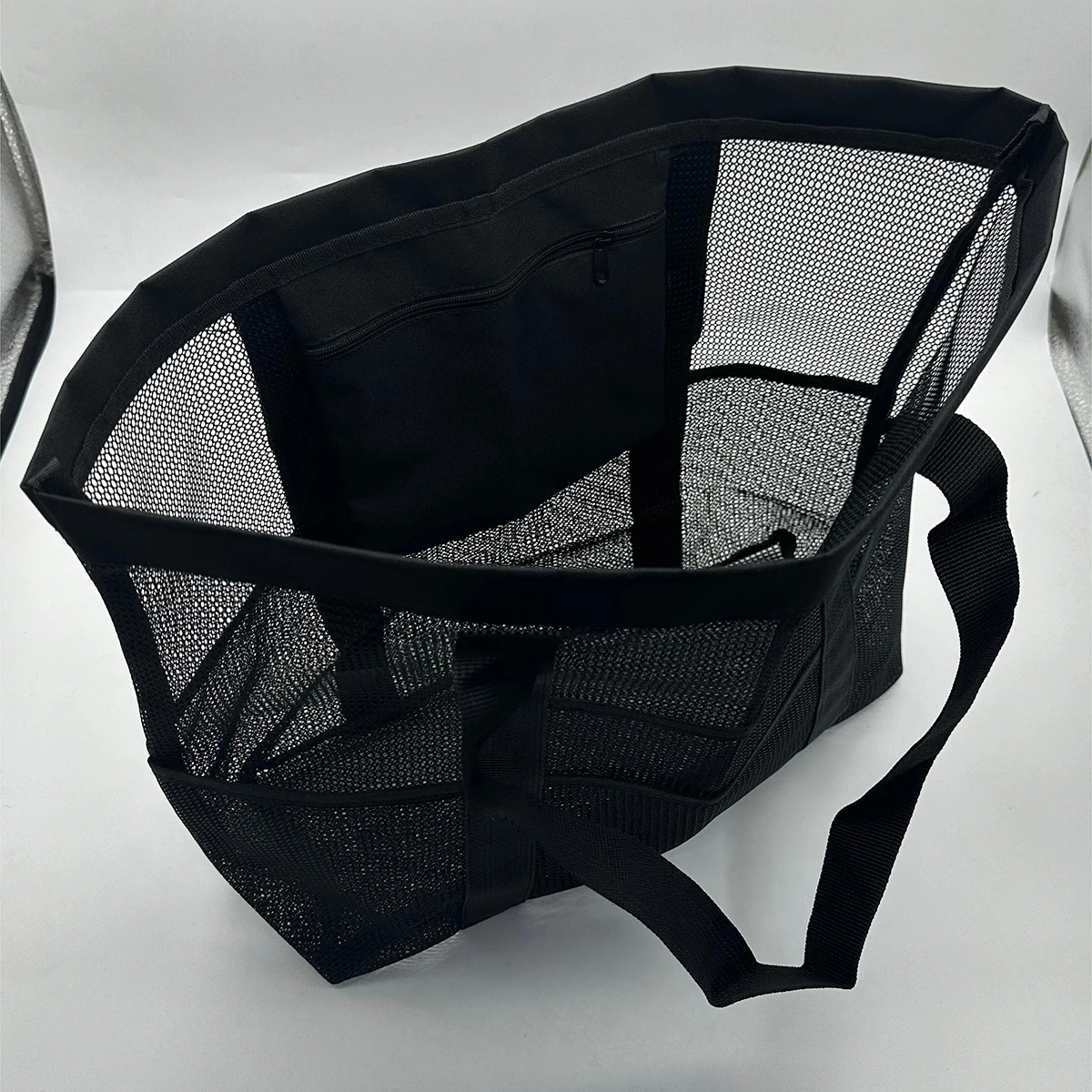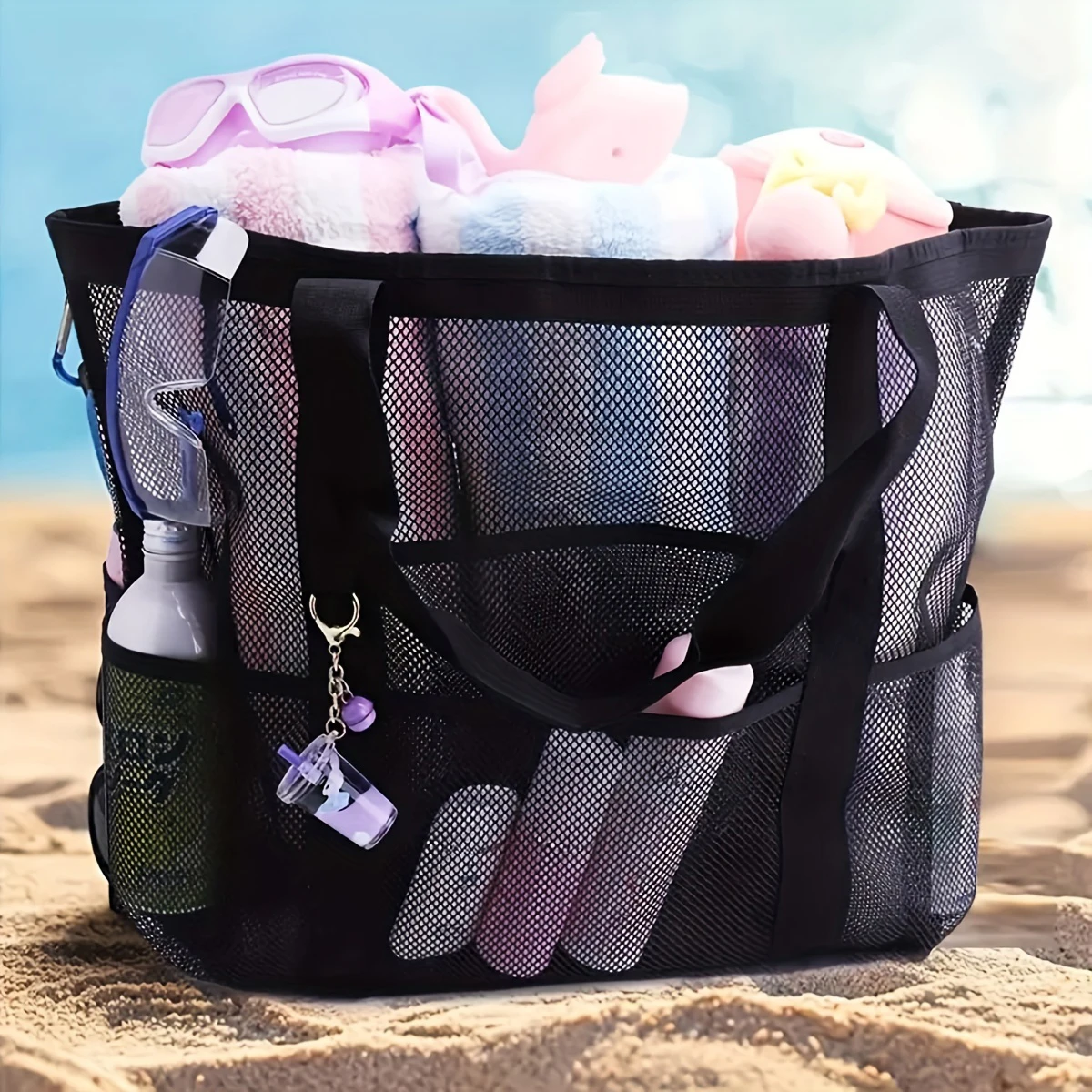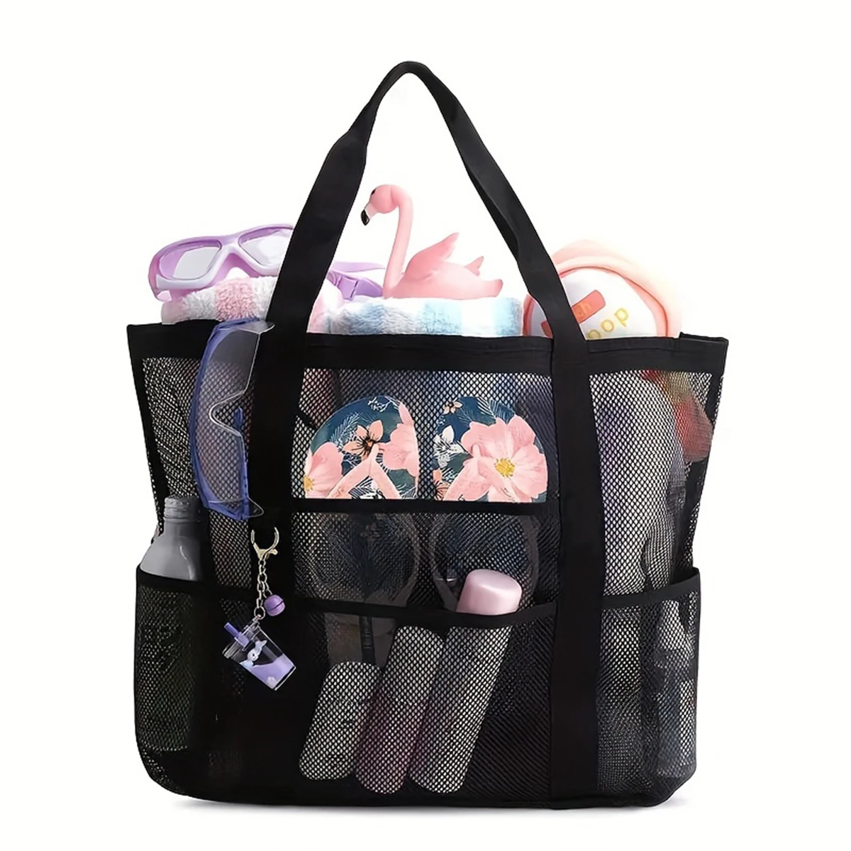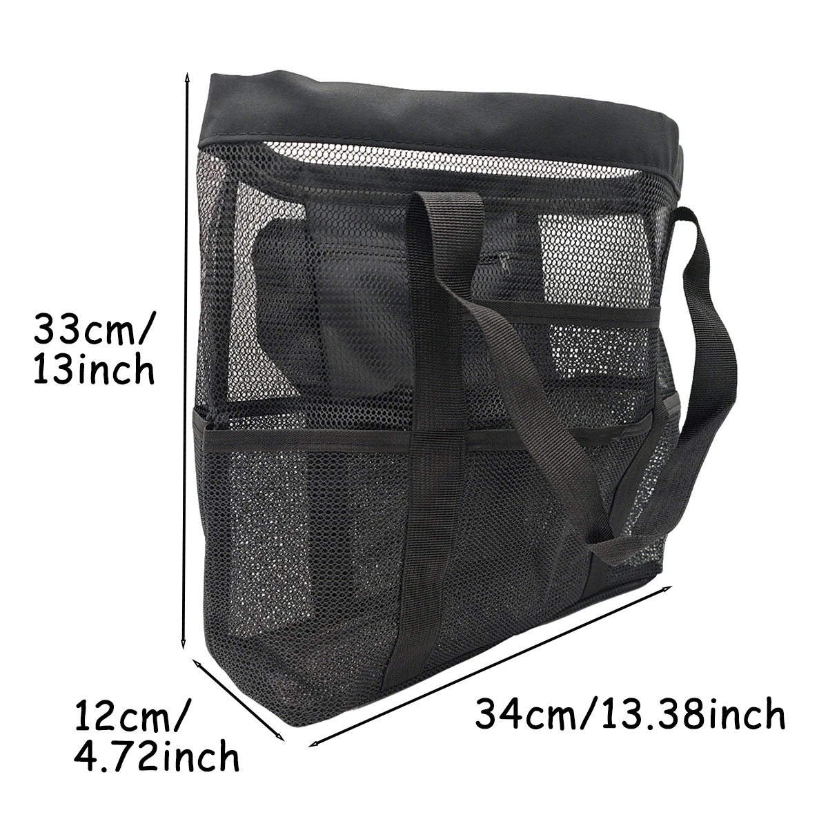 Carry your essentials effortlessly with this mesh beach tote bag, designed with a large capacity to hold towels, toiletries, makeup, and more, made from breathable mesh material that allows sand and water to pass through easily, featuring multiple pockets to keep items organized and within reach, lightweight for easy carrying during beach trips and travel, with strong handles for comfortable and reliable use, ideal for swimming, vacations, gym, or daily activities, crafted with quick-drying fabric for convenience after water use, spacious enough for all your beach essentials without feeling bulky, making it a versatile and stylish bag for all your summer adventures.